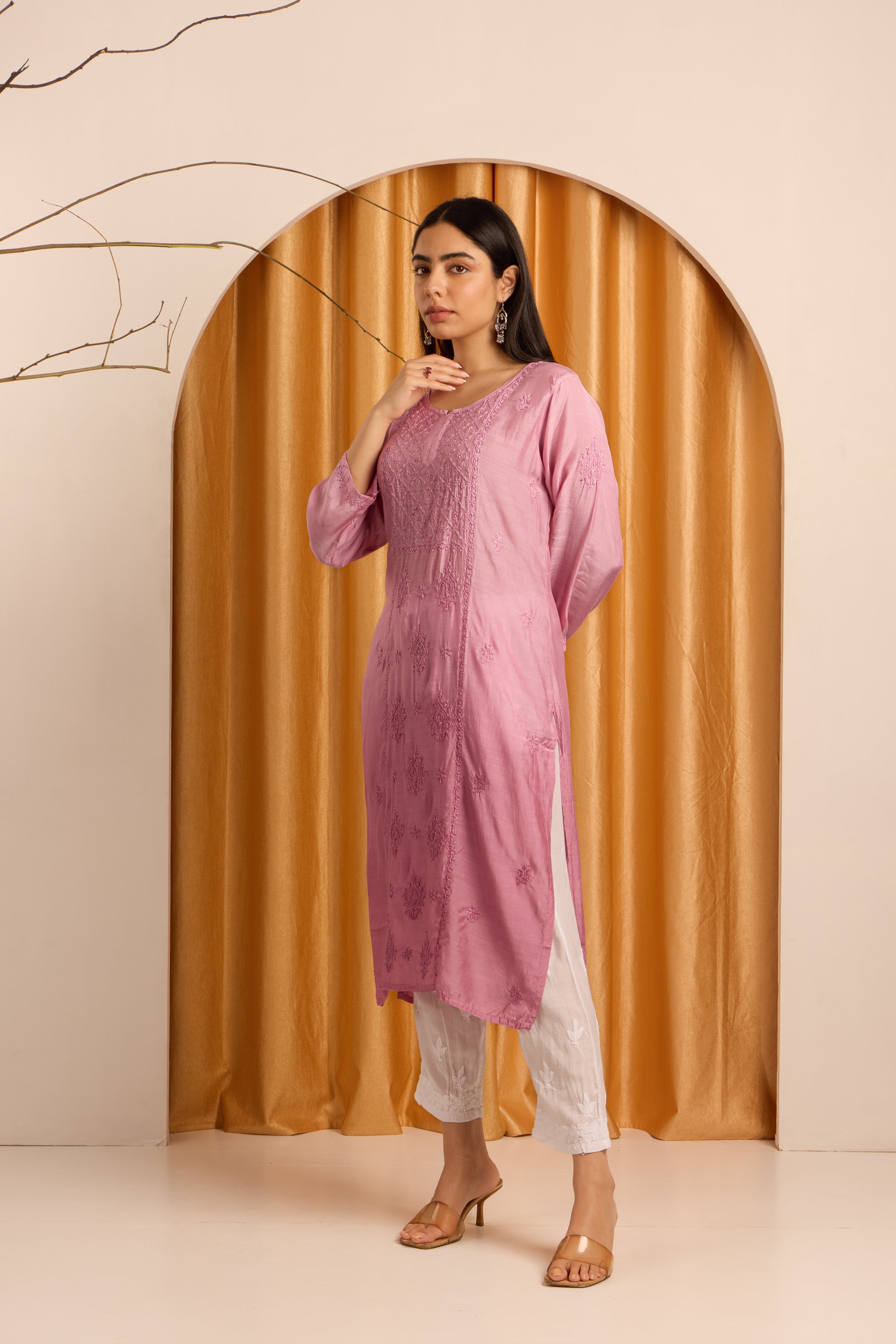 Enchanting Rose Pink Chikankari Muslin Kurti with Mukaish work