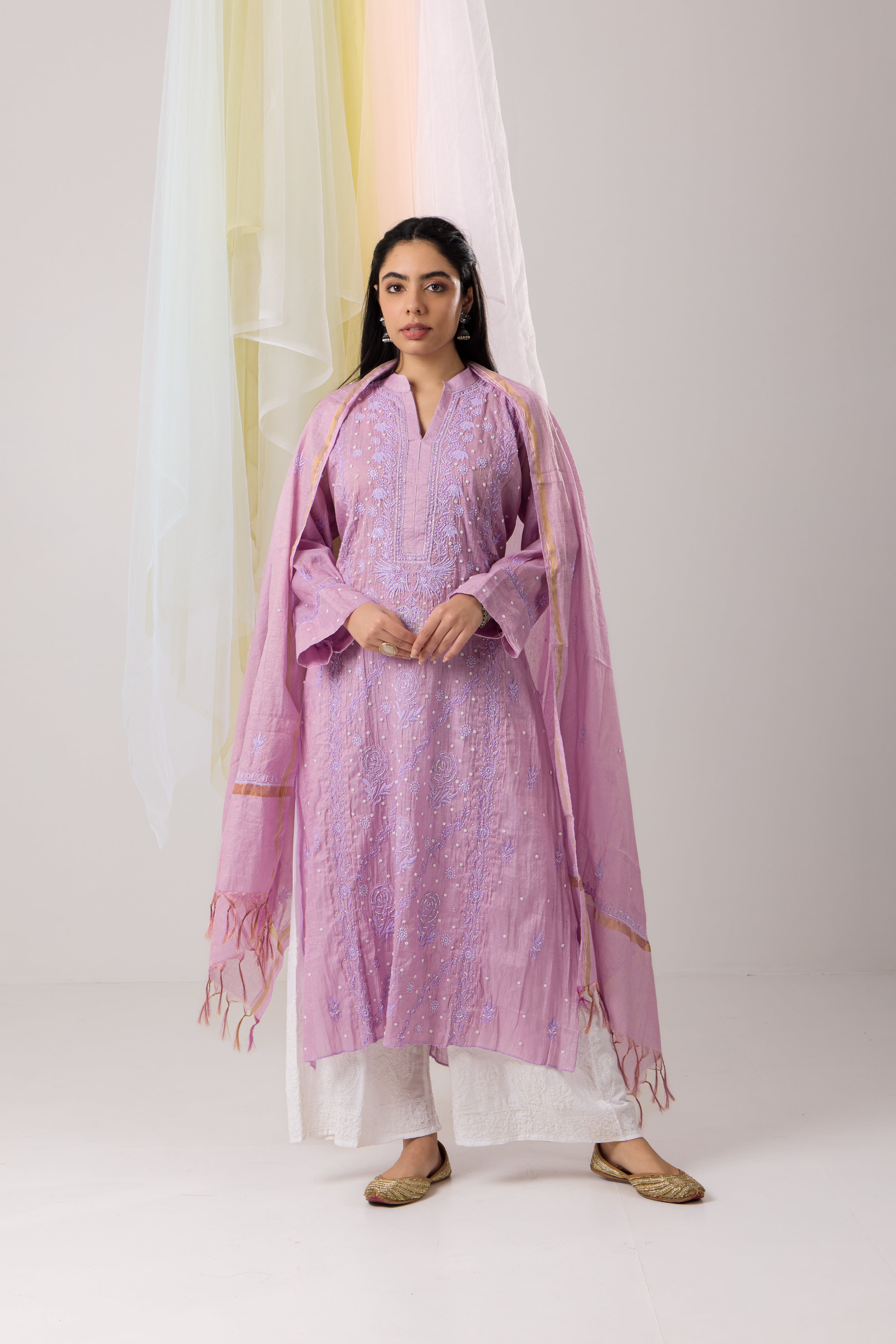 Luminous Lavender Chikankari Zari Tissue Kurta Dupatta Set