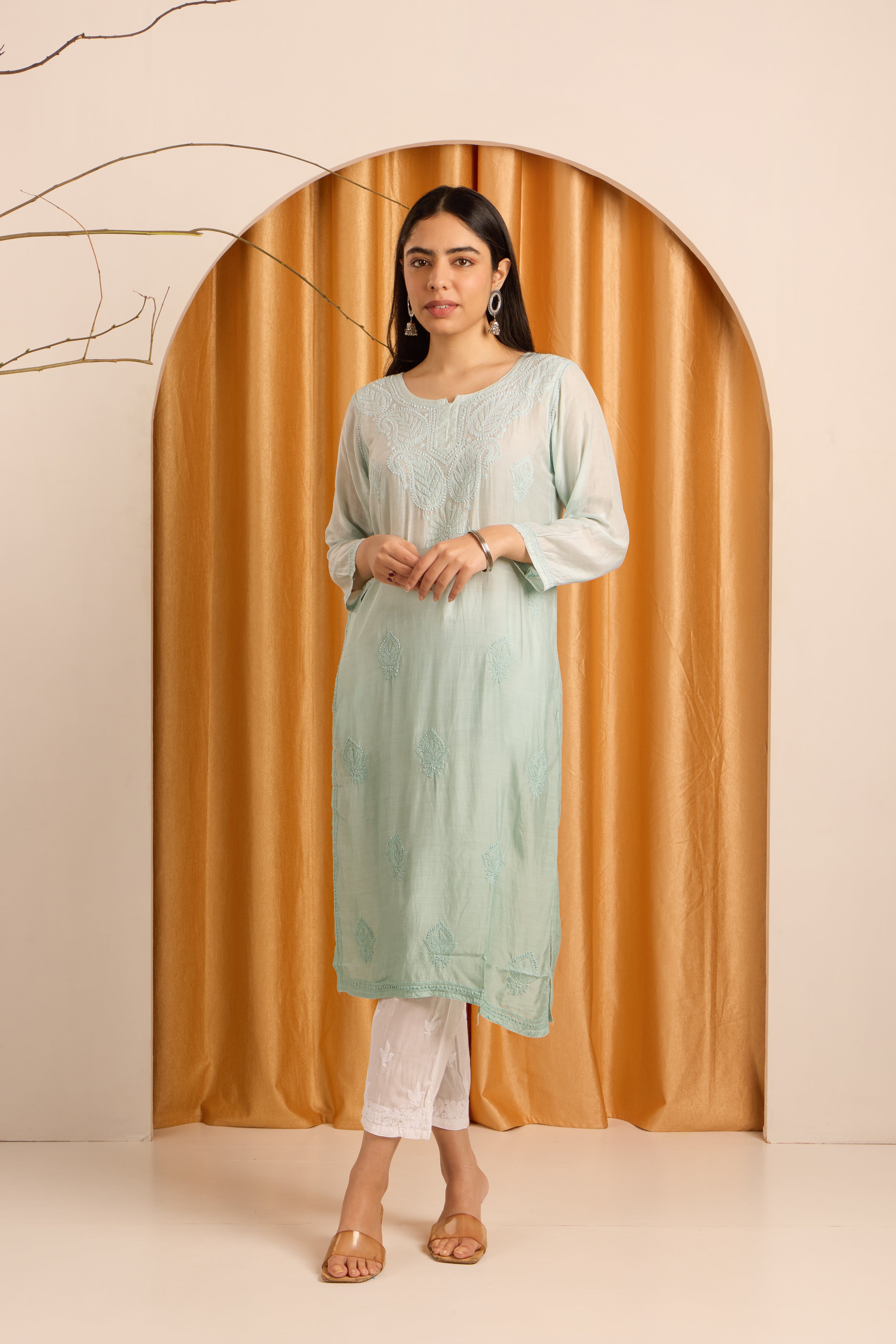 Drift into a world of serenity with our Chikankari Misty Teal Ombre Kurti soft Muslin fabric, featuring delicate ombre shades