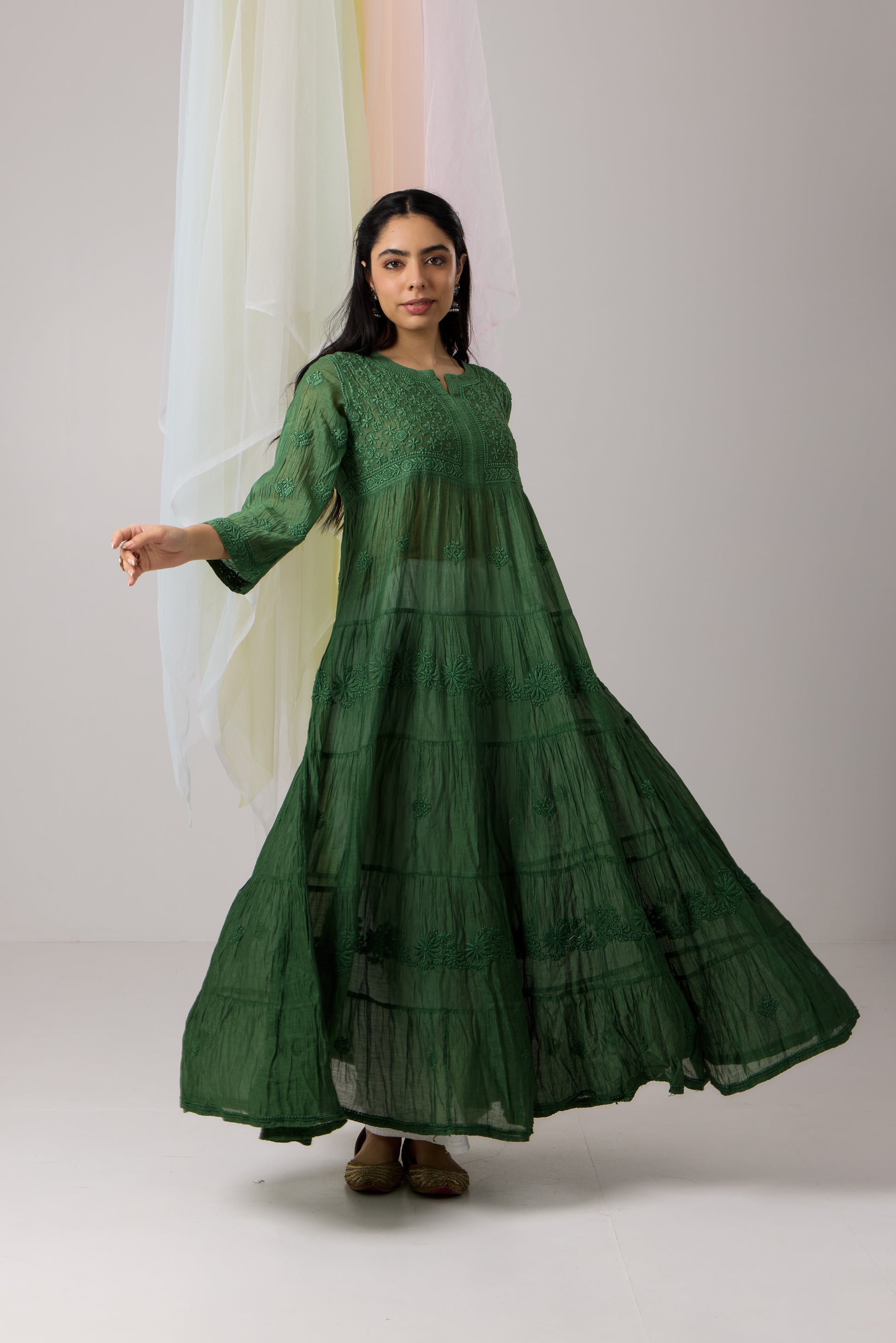 Captivate hearts with our Enigmatic Dark Green Chikankari Flared Dress, tailored from premium Mul Chanderi fabric for a refined and elegant look